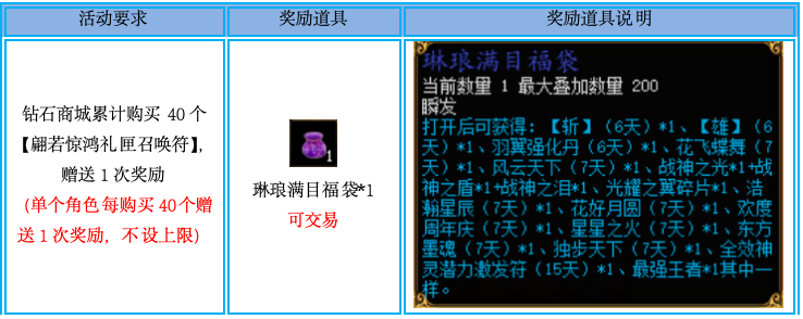 2、活动期间,单个角色在钻石商城每累计购买满40个【翩若惊鸿礼匣召唤符】,可获得1个“琳琅满目福袋”,不设上限。例如:玩家A在钻石商城购买了80个【翩若惊鸿礼匣召唤符】,则可以获得2个“琳琅满目福袋”的奖励;