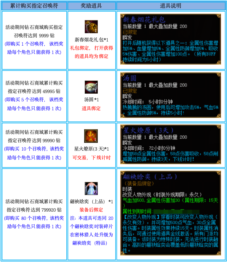 活动期间,单个角色在钻石商城累计购买【翩若惊鸿礼匣召唤符】达到以下指定要求可获得活动奖励,但每档奖励只能获得1次: