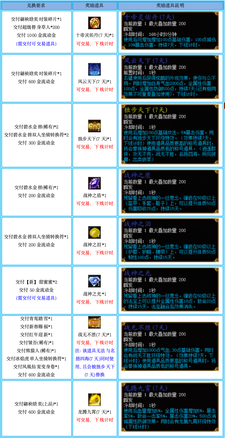 4、本次道具的兑换将在活动结束后下架,还请有需要的玩家抓紧时间兑换。